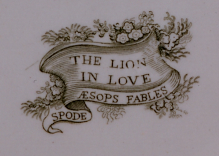 | Spode soup plate, printed in green (not brown, sorry, poor image) featuring The Lion in Love, c1830 |