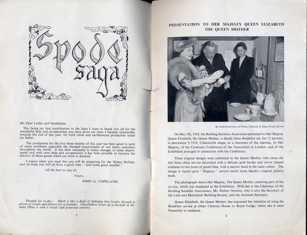 These magazines were produced a few years after World War II when rationing was still in place and the factory was struggling to find its place in the 'new world' which had emerged in the late 1940s and early 1950s. Spode archive records and minute books show the discussions and difficulties at this time with the urge to modernise the factory; and to embrace the new generation of Copeland family coming on board as young directors, yet faced with falling demand and recession, particularly in overseas markets.