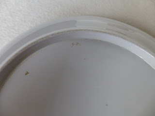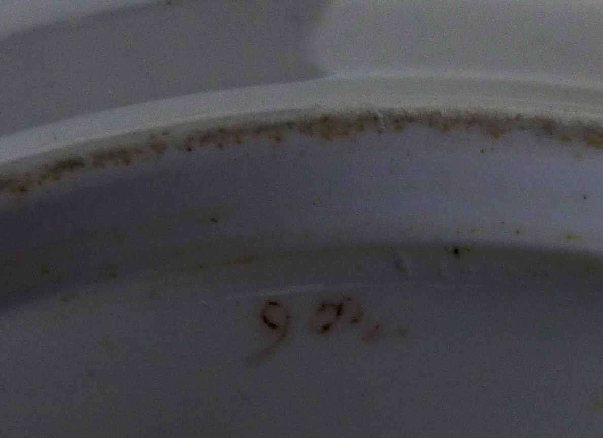 Of this set of 3 pieces there was only one piece with any backstamps, or marks, and that was the B & B. These were in gold and had suffered some wear. Usually, but not always, the pattern numbers are painted on in red - it depended on the process and on the colours being used. There is no handpainting on this piece so the gilder applied the mark in gold along with his/her cypher. The pattern number 984 is visible after careful looking. Have a look at my detailed image of the mark. The 9 is fairly clear. The 8 is on its side in the style of writing numerals at this period. And the 4? Well, I knew the number, but if it had needed researching you would only have had to look at a few pattern records 980 to 989 to find out more. There are no 2 digit pattern numbers at this period and a 4 digit number beginning with 9 would be too late a date for the style.