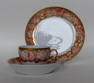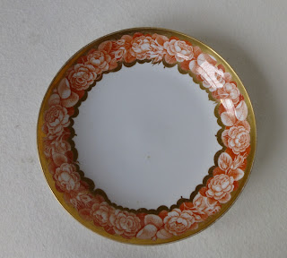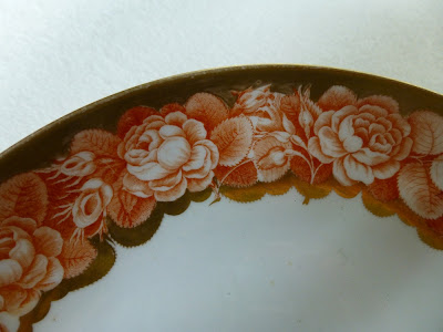 What of the design? The roses are beautiful (and this is from someone who doesn't much like cultivated roses although I will tolerate wild ones in the garden). The print is in iron red which gives a delicate effect combined with the 'pluck and dust' printing method. I have seen this pattern described as a print on a solid gold background but this does not seem correct. The gold is cleverly applied above and below the print following the flow of the rose border and highlighting little stems along the way and gives the appearance of a solid gold background. Against Spode's very white bone china the effect is stunning. Seen in natural light or candlelight it is extremely elegant. There are some blemishes in the manufacture of the body but, as my husband pointed out, this is still very early days for bone china, probably invented at Spode in about 1799/1800. Spode's recipe was to become the industry standard and with the quality of these pieces, even with a few marks, you can see why.
