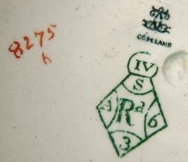 | Punch bowl backstamps: printed Copeland mark, painted pattern number & decorator's cipher, printed registration mark, & unidentified impressed mark |