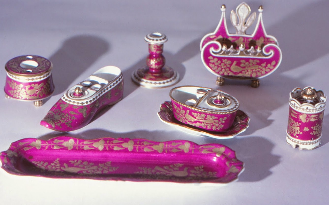 In the image labelled 'writing necessities' you can see a range of items in pattern 3993 made in about 1824. Spot the slipper inkwell on the left behind the pen/pencil tray. Pattern 3993 is decorated with a crimson ground - crimson is a derivative of gold and consequently a very expensive colour for ceramic decoration. This is coupled with decoration in a technique known as 'raised and cut up'. Look under R on the
